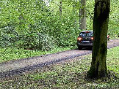 Fahrer fährt mitten durch Grünanlagen (Wandsbeker Gehölz) mit seinem Auto. Ist ja auch nur ein Erholungsgebiet, da muss man natürlich verbotswidrig mit seinem Auto durchrollen.
