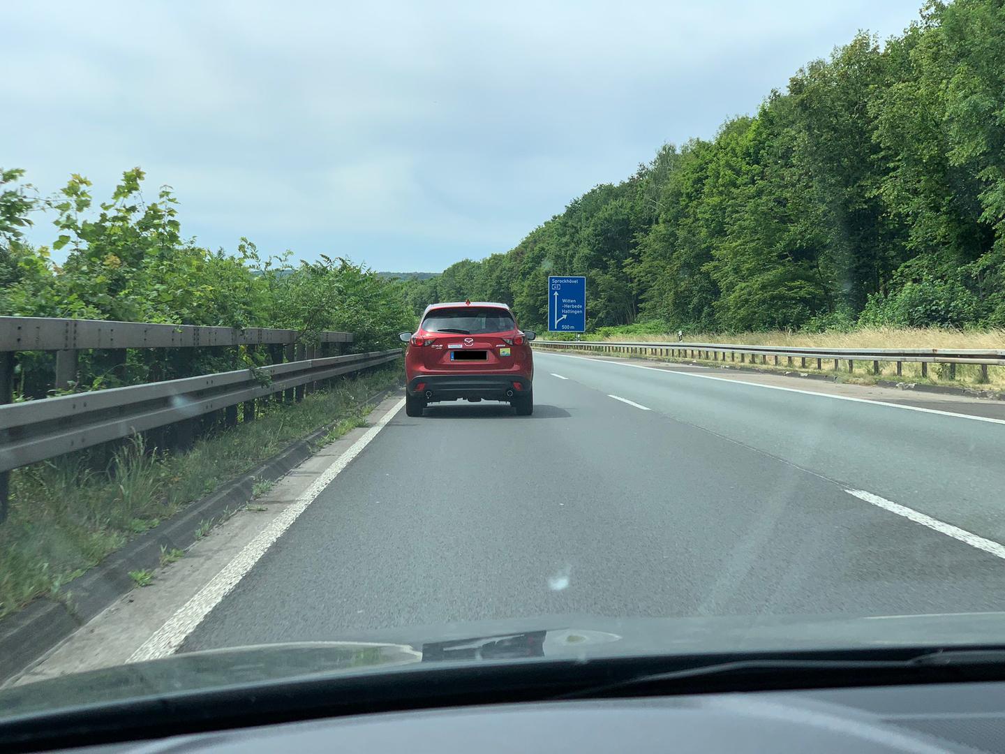Unfassbar der Typ! Überholt mich während des Auffahres auf die Autobahn, trotz Überholverbots und zieht über 2 Spuren direkt auf die ganz linke. Als ich dann die Gelegenheit habe fahre ich auch auf die Linke Spur und fahre normal weiter. Als ich seiner Meinung nach zu dicht auffuhr, bremste er ohne ersichtlichen Grund voll und zwang mich ebenfalls zur Vollbremsung. Wenig später fuhr er dann endlich nach rechts. Als ich überholte bemerkte ich, dass er auf einmal auch anfängt zu beschleunigen und mir den Mittelfinger aus dem Fahrzeug entgegen streckte. Ich überholte und fuhr dann vor ihn. Auch ich bremste einmal, da ich ehrlich gesagt schockiert von der Dreistigkeit war und in Anbetracht der möglichen Ausgänge eines solchen Manövers offen gesprochen wütend wurde. Ich fuhr mit Richtgeschwindigkeit fort und nun setze er erneut zum Überholen an, zeigte mit dem Finger auf etwas, das anscheinend eine Dashcam sein soll, streckte erneut den Mittelfinger raus und warf mich Kussmünder zu.