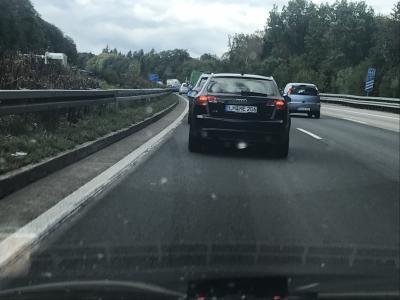 Fahrer zieht ohne Blinker zwei Spuren nach links und verfehlt mich nur knapp. Beschleunigt daraufhin auf 150 km/h trotz Baustelle und Verkehr und drängelt anschließend die im zäh fließenden Verkehr befindlichen Verkehrsteilnehmer